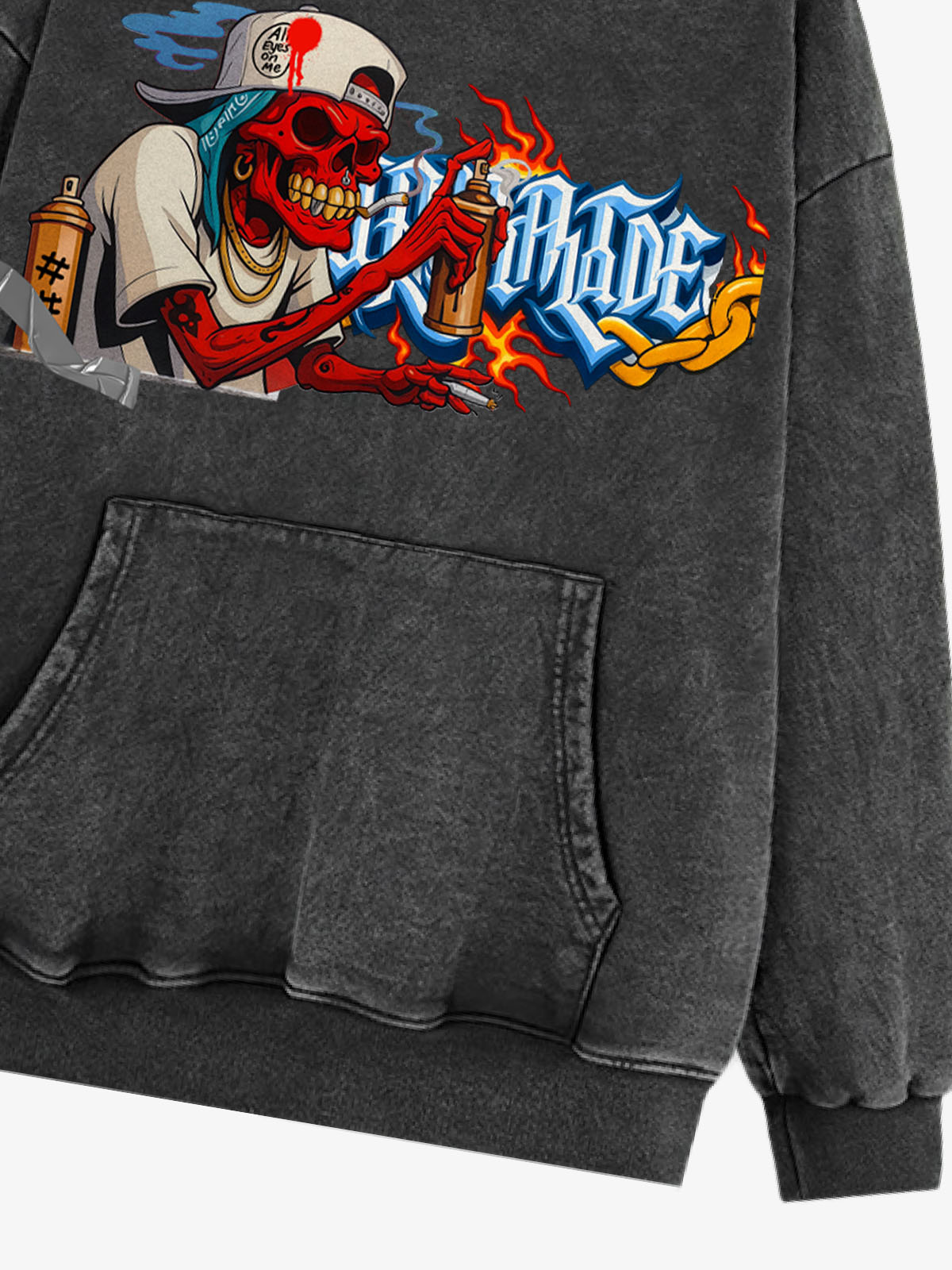 • Design Elements: Vibrant skull graphic print with flame accents, crossbones motif, graffiti-style lettering, spitfire pattern details