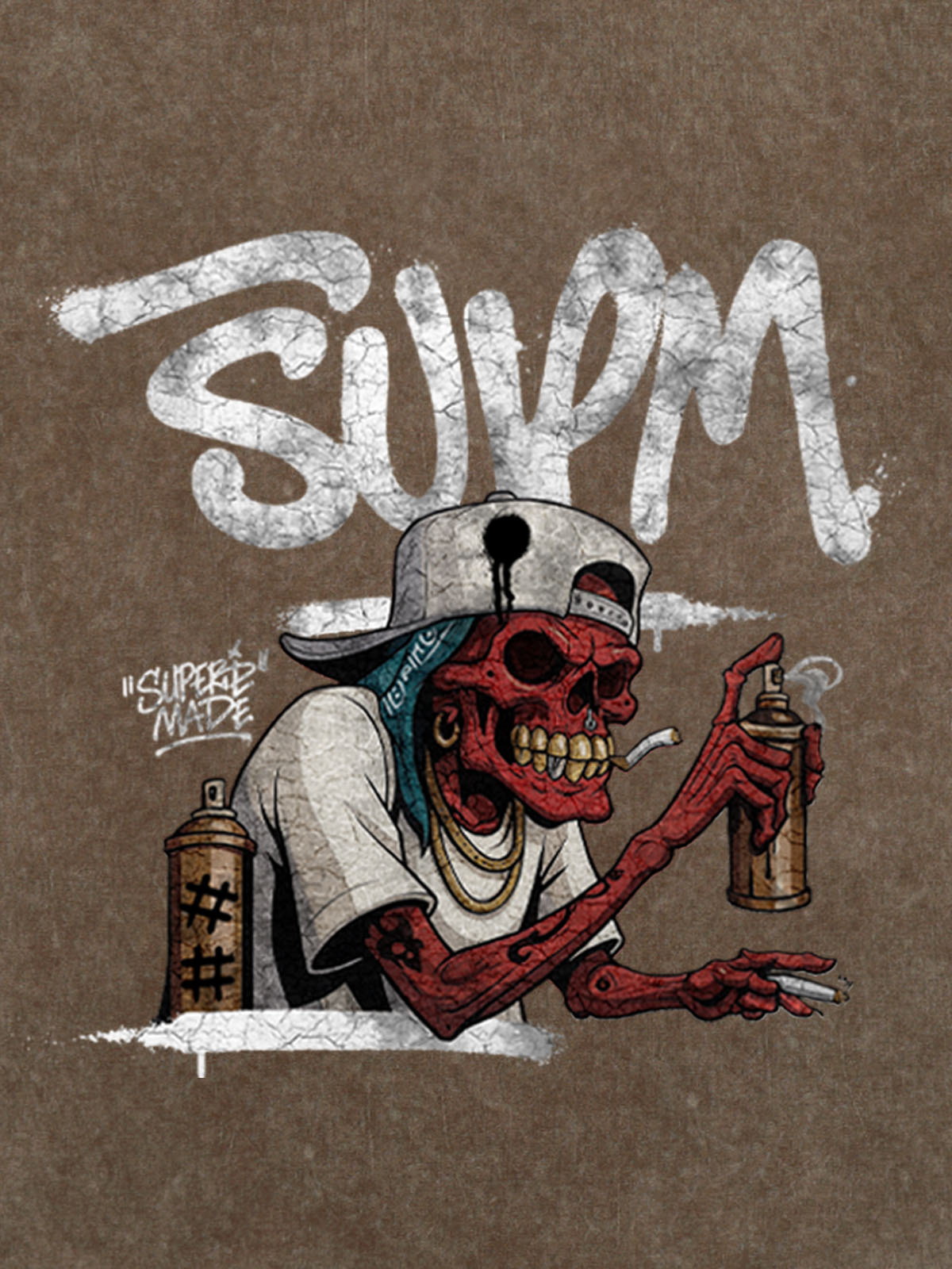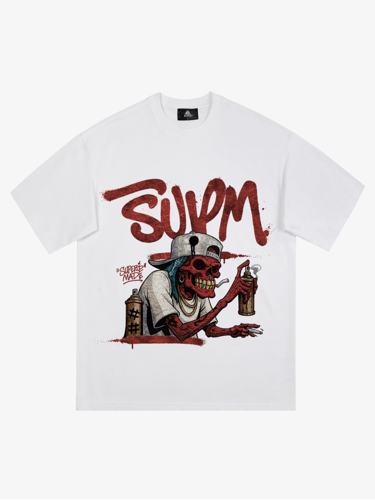 • Design Elements: Bold graffiti-style “SUPM” lettering, vibrant skeleton spray-painting graphic, vintage washed effect