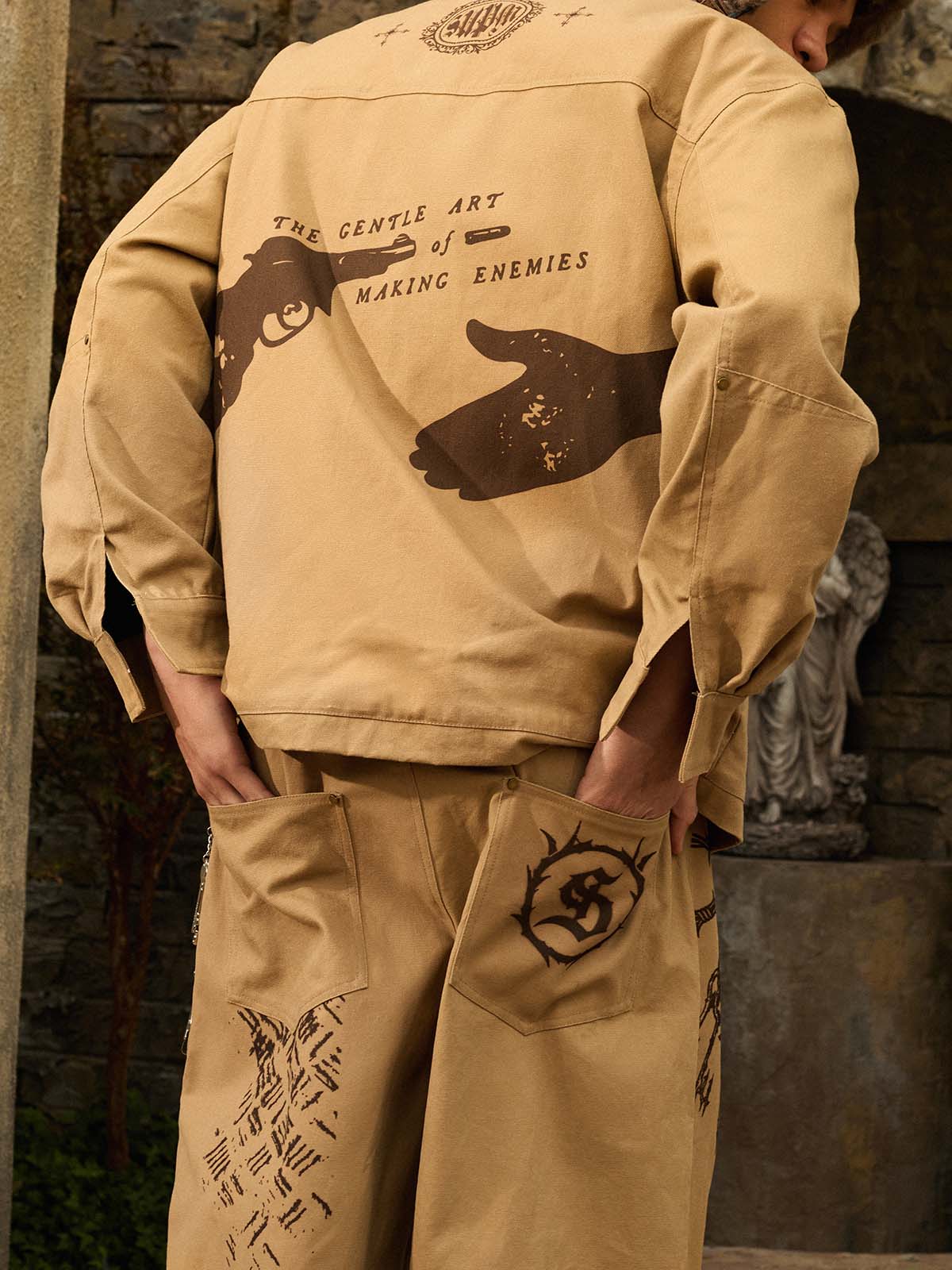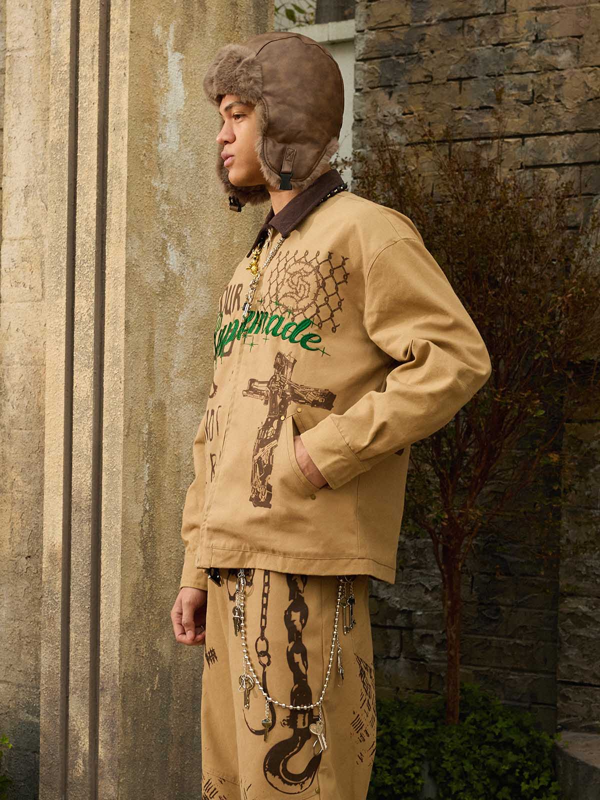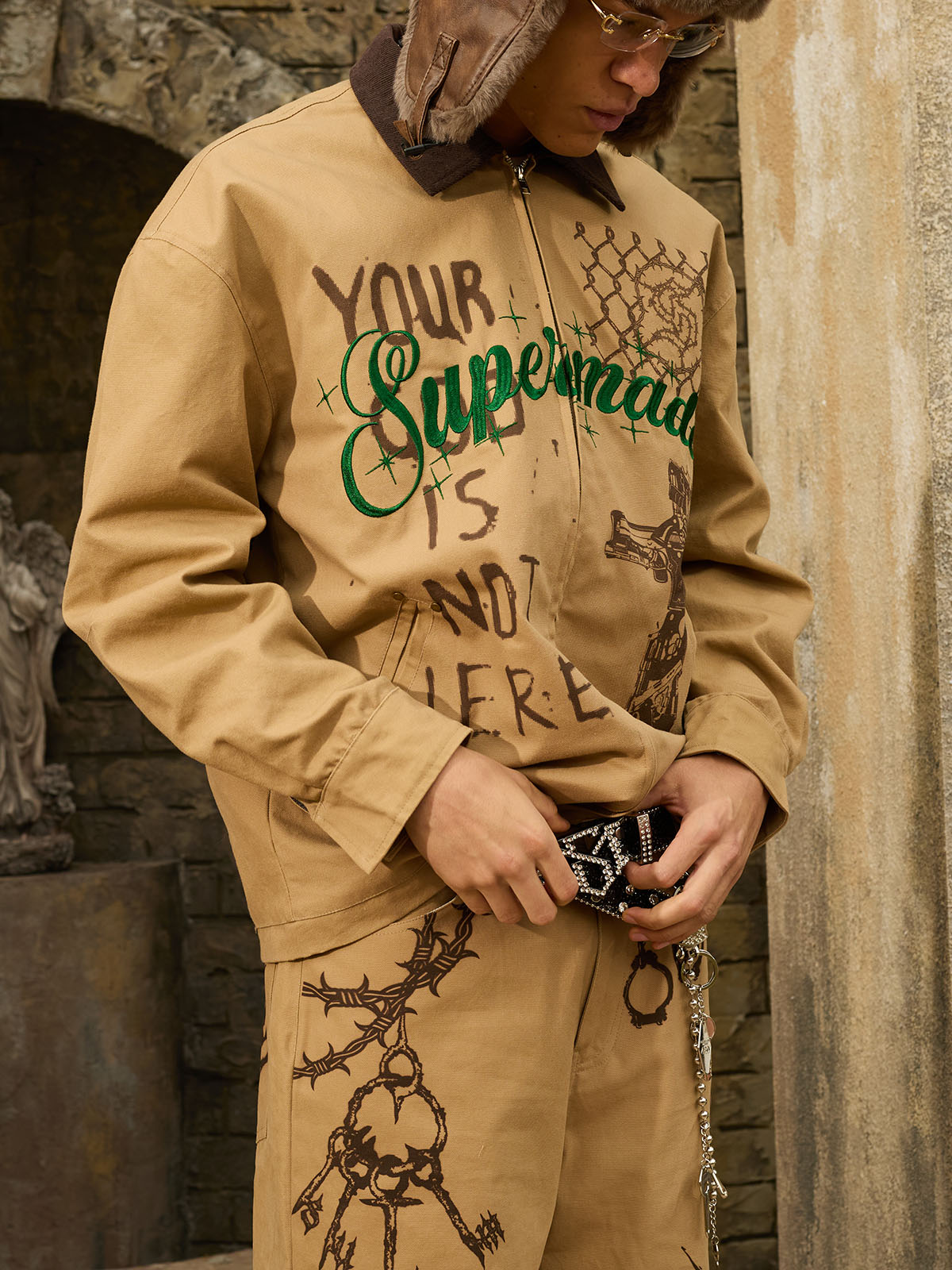 Bold slogan embroidery adds attitude without looking overdesigned