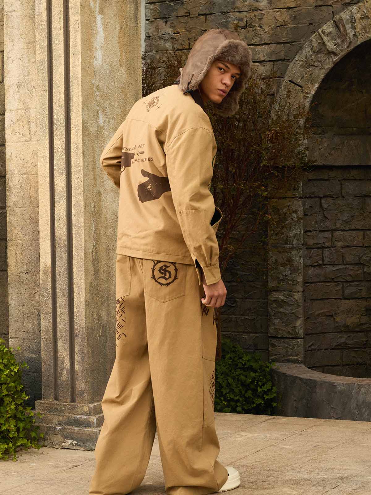 Detail Features: Color-block canvas fabric with embroidered slogan text, retro-inspired graphic placement, durable texture, coordinated top and bottom design