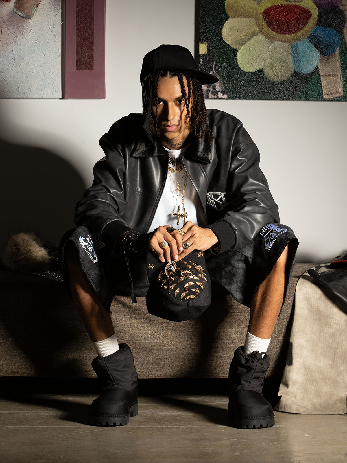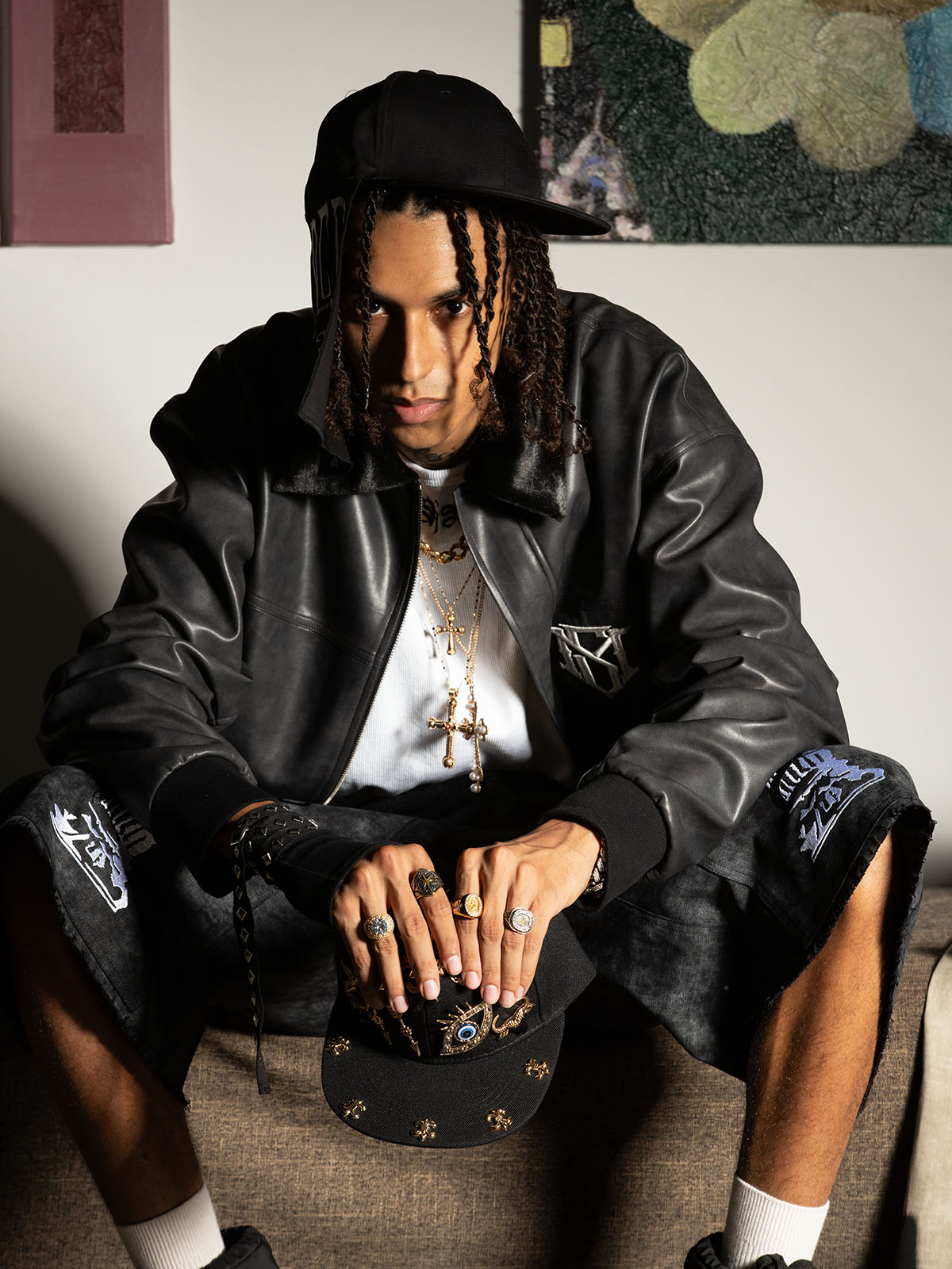 • Design Elements: Embroidered Logo on Chest, Distressed Shorts with Graphic Prints, Layered Look with Headwrap