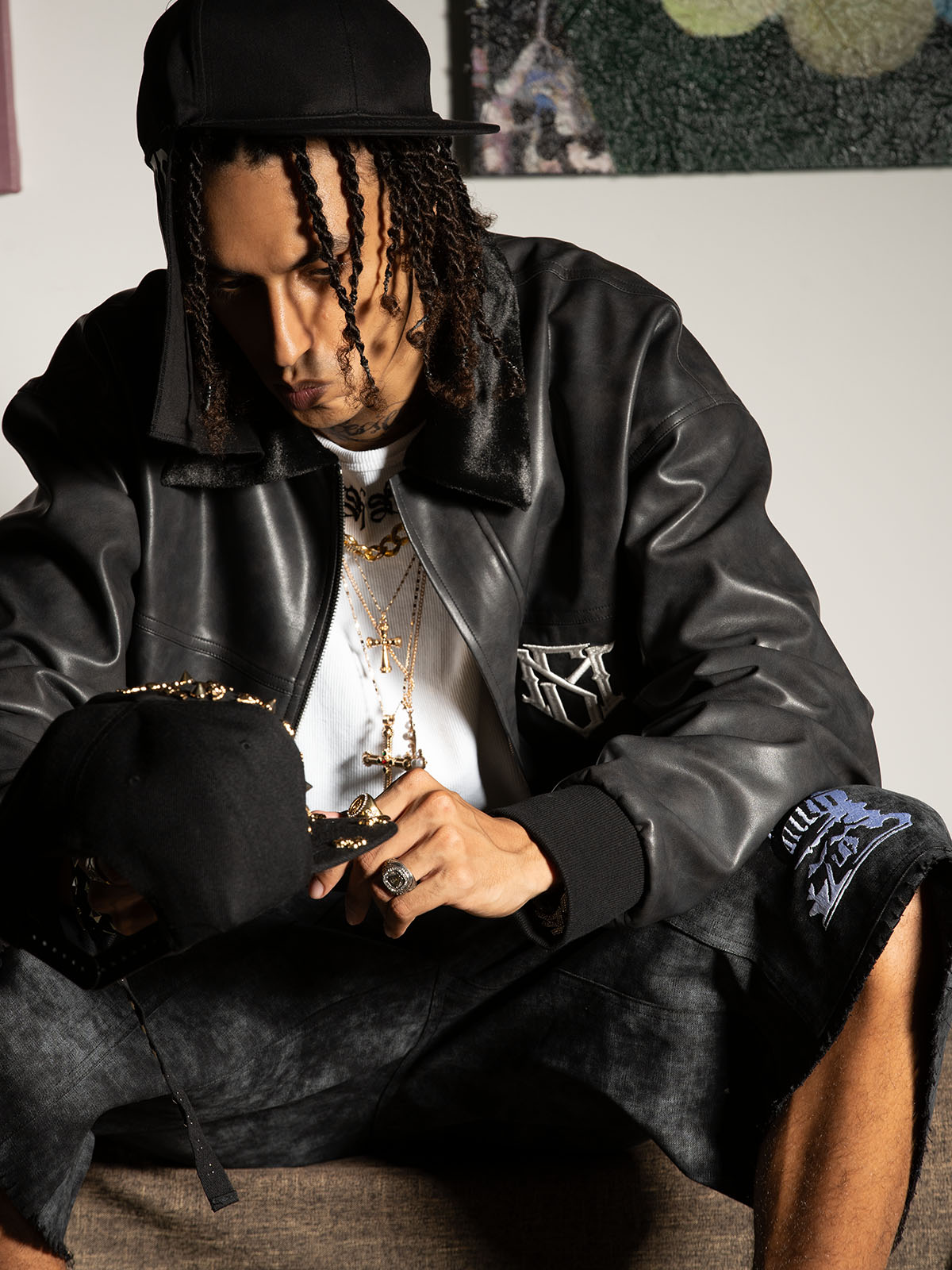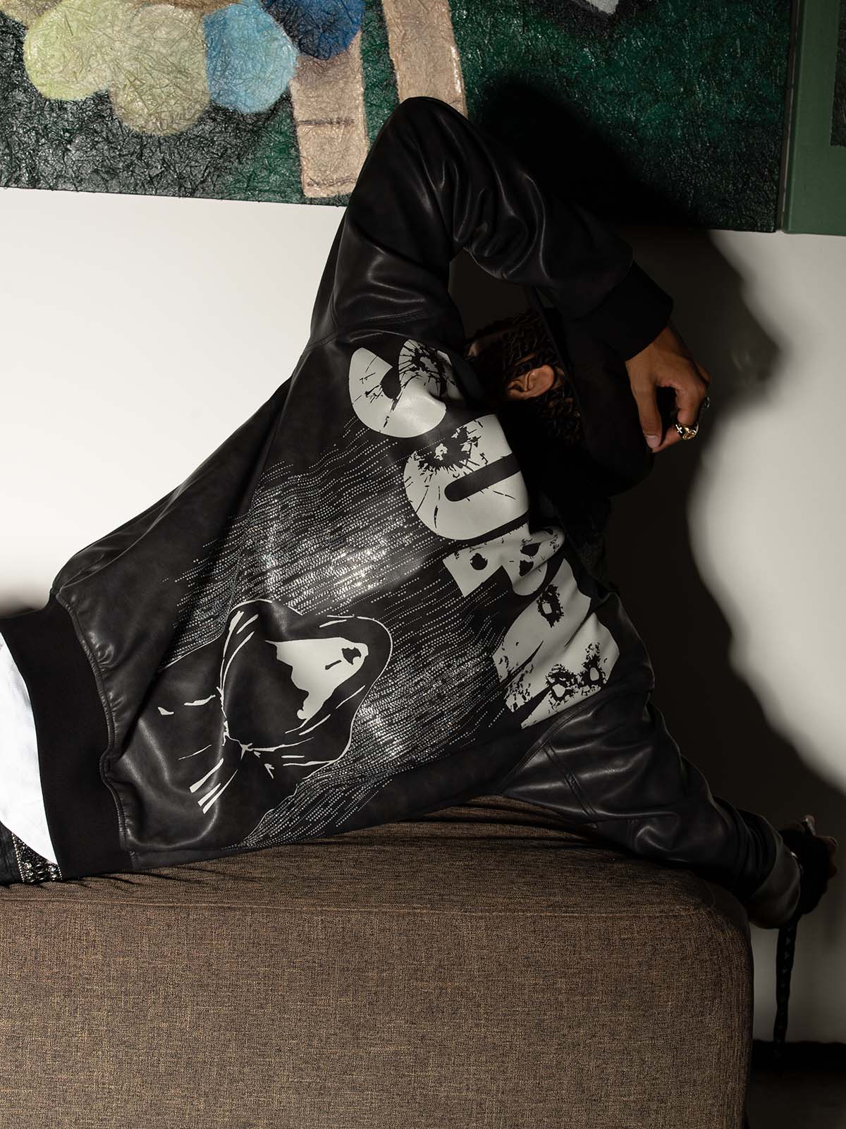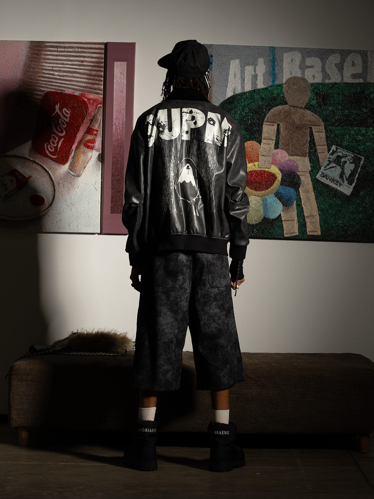 SUPM Fur Collar Rhinestone Pattern Leather Jacket