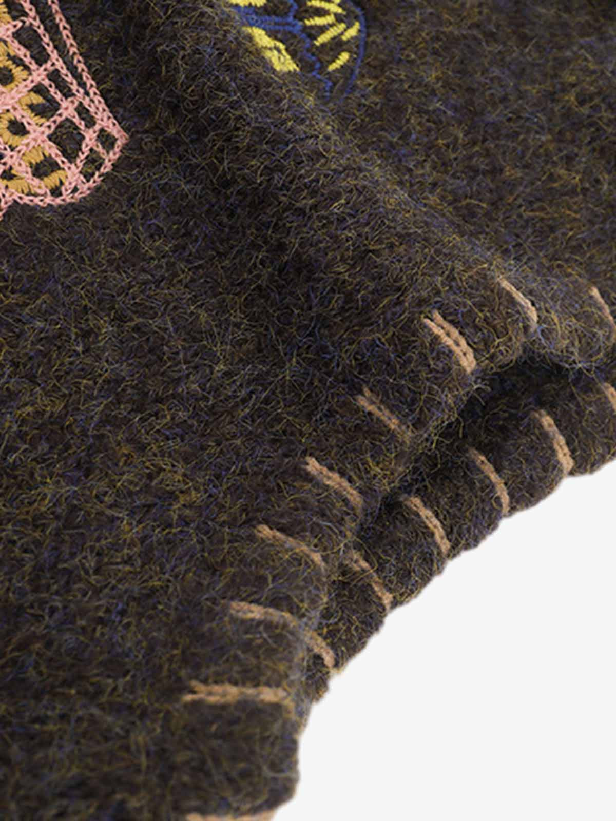 Soft fuzzy knit fabric with a warm textured feel. Playful embroidered graphics across the front create a unique artistic look. Contrast hand-stitch style detailing around the neckline and armholes adds a crafted vintage vibe. Relaxed sleeveless vest silhouette that layers easily over tees or shirts.