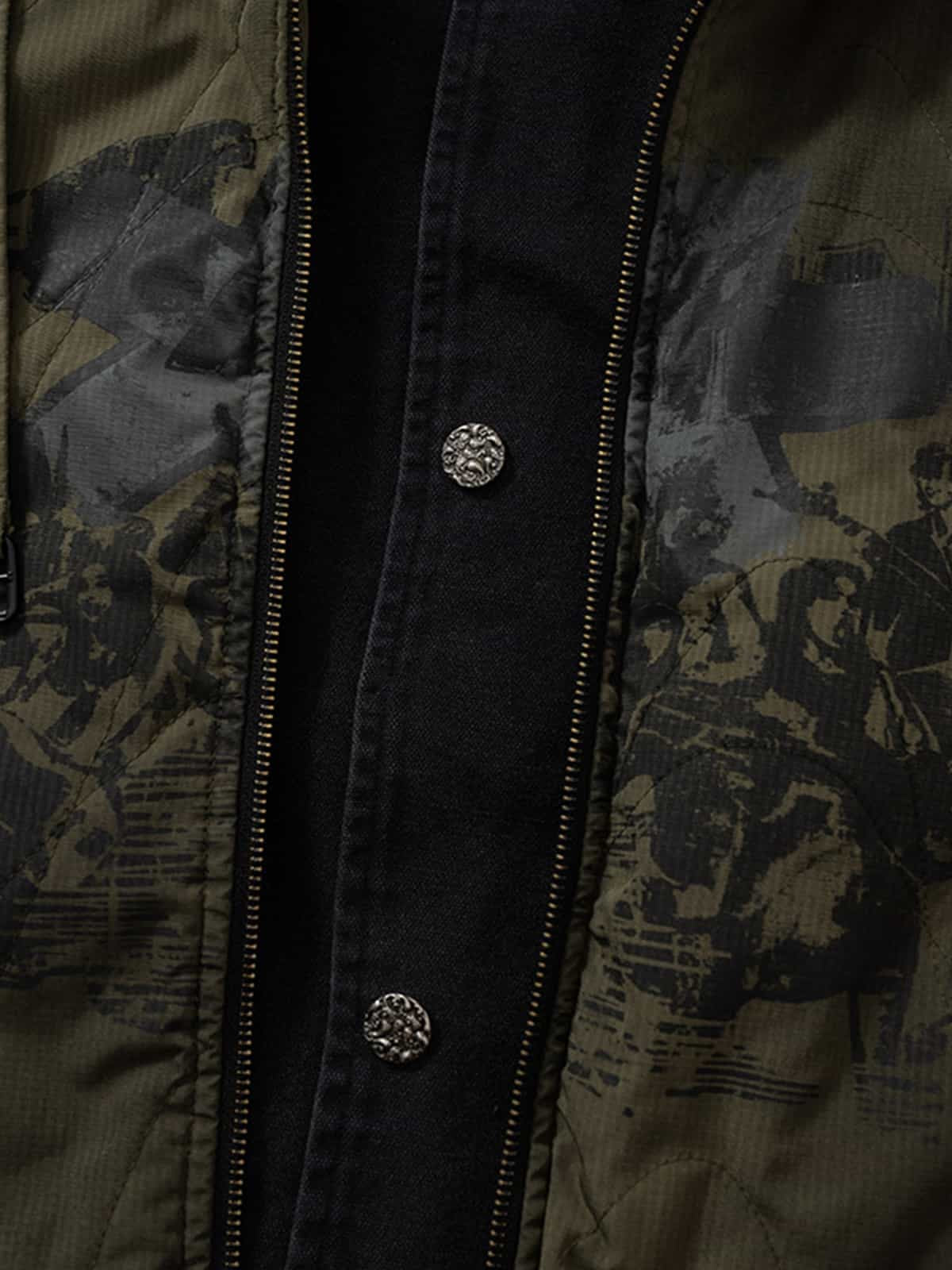 Vintage Quilted Military Patchwork Zip-Up Hoodie Jacket
