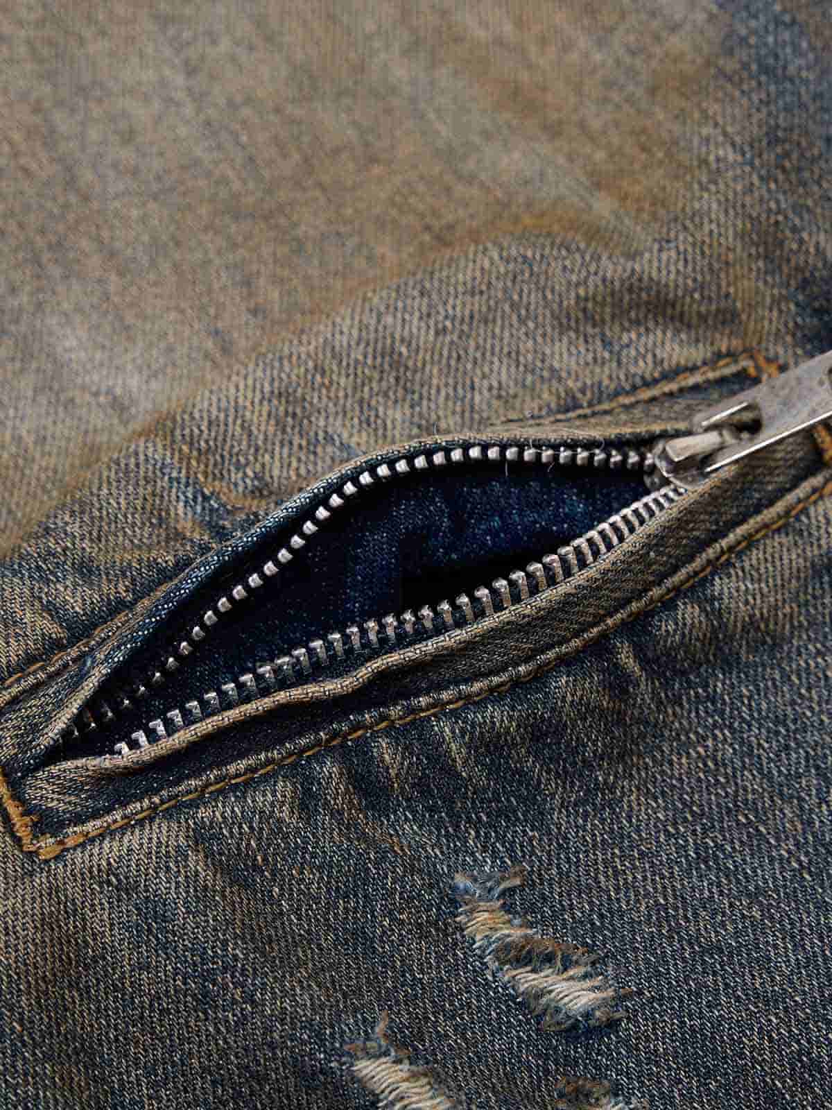 • Details: Front zipper closure, two slanted hand pockets, chest zippered pocket, distressed patches, faded wash effect