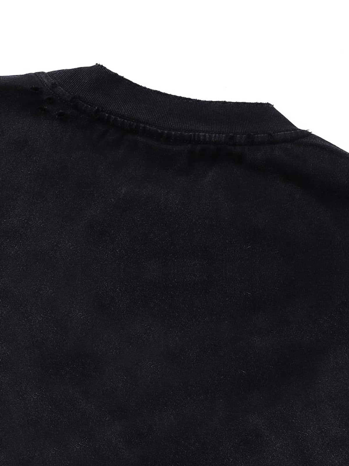 Constructed from cotton-blend fabric, this short sleeve T-shirt features a heavily vintage washed finish that delivers a naturally faded, worn-in street aesthetic. The body is detailed with multiple logo graphic prints layered across the garment, enhanced by distressed hole treatments for an authentic retro grunge vibe. Designed for everyday styling, it balances statement visuals with relaxed comfort.