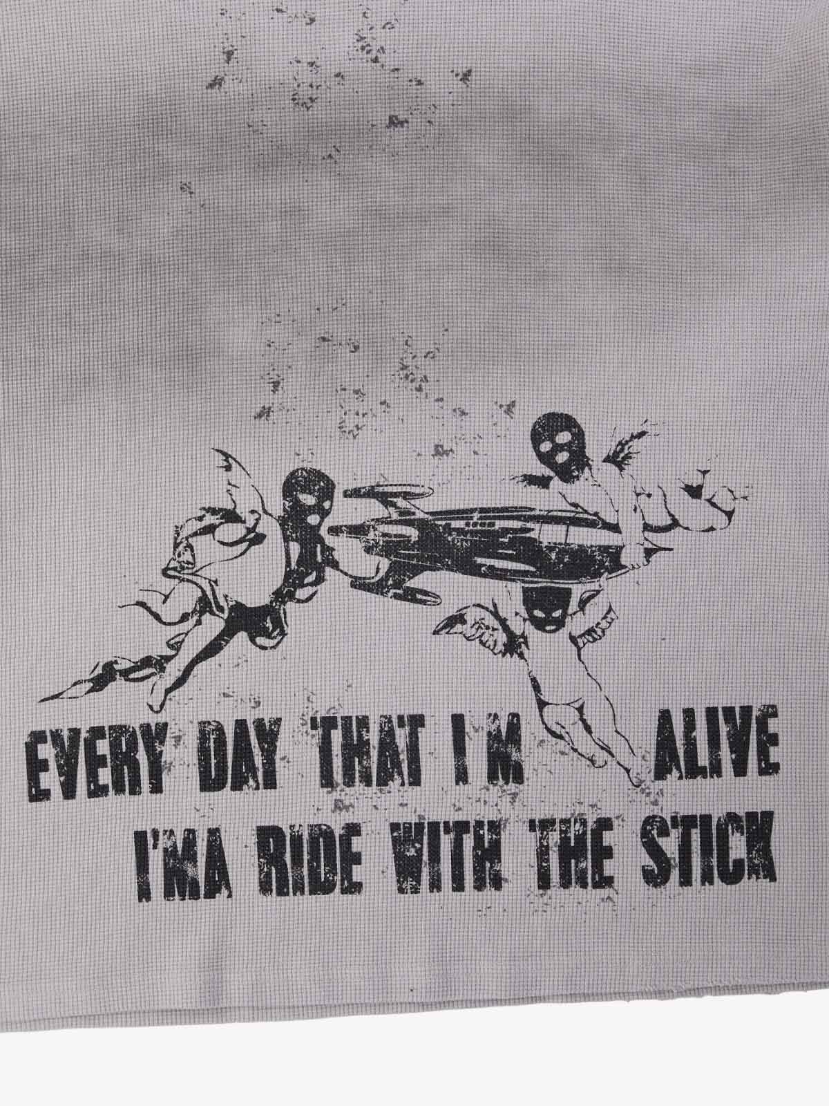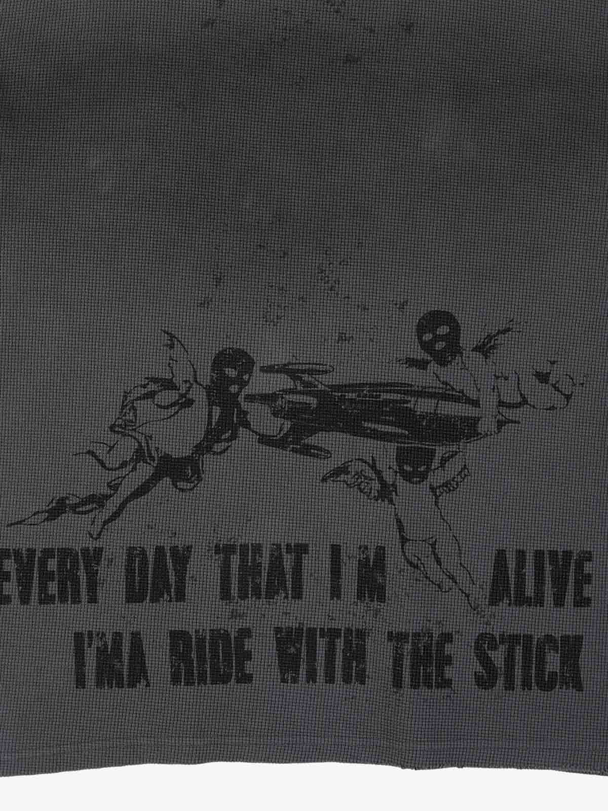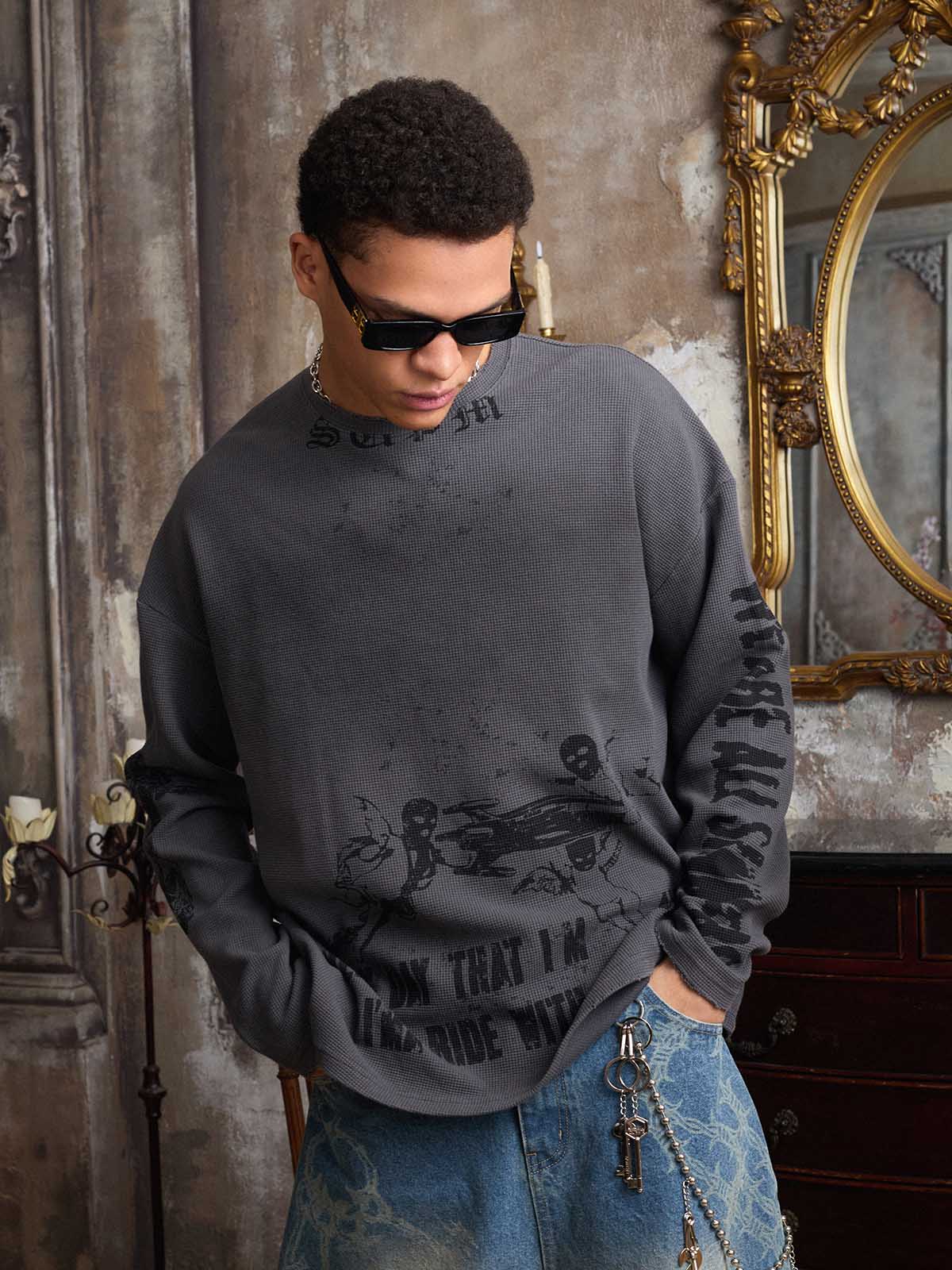 Constructed from a cotton-blend fabric, this long sleeve T-shirt features a textured waffle surface enhanced with heavy spray wash treatment for a worn, vintage look. The piece is finished with bold graphic prints and slogan artwork across the front and sleeves, delivering a raw street aesthetic. Subtle distressing and faded tonal variations add depth, making it a standout layering essential for everyday wear.